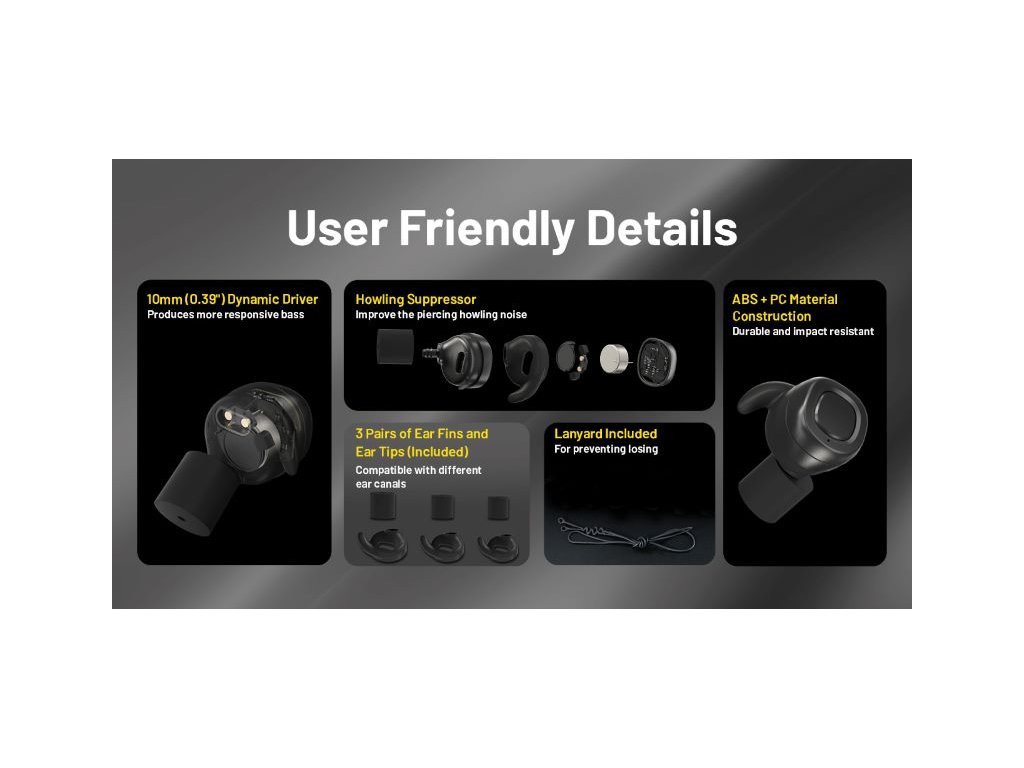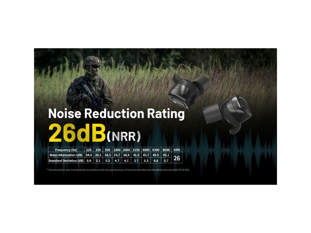 Căștile Nitecore NE20 excelează cu o viteză de răspuns la zgomotul ambiental de până la 0,1 secunde și oferă o transmisie clară a vocii. Datorită tehnologiei avansate, acestea combină amortizarea electronică activă cu protecția pasivă sub formă de dopuri de spumă, care sunt disponibile în trei dimensiuni (S, M, L).