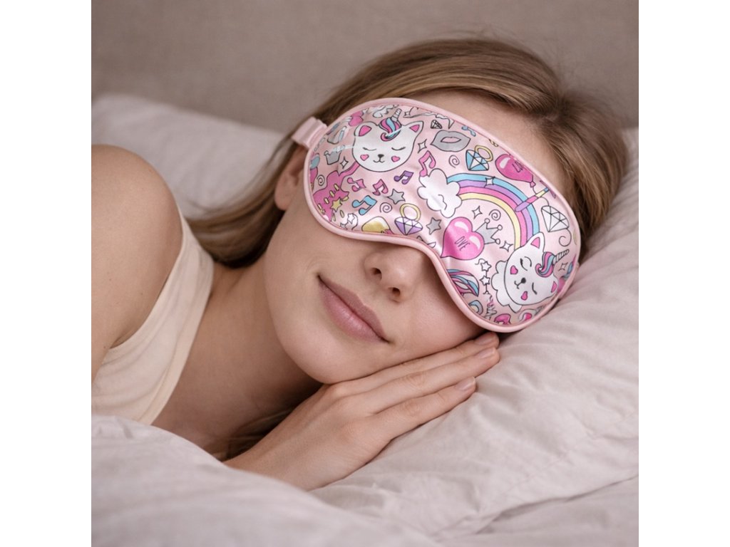 Mască de dormit pentru ochi cu motiv de pisici, unicorni și curcubeu. Confortabilă, plăcută pe față și protejează ochii de lumină. Masca are o umplutură ușoară care asigură o potrivire mai bună pe față. În același timp, poate oferi puțin mai multă căldură.
