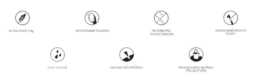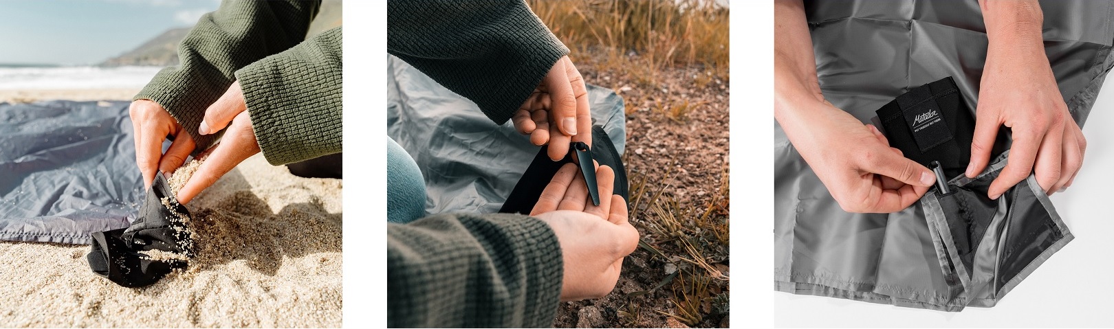 • buzunarele de pe fiecare colț pot fi umplute cu nisip sau pietre pentru a menține pătura pe suprafața unde cârligele nu pot fi utilizate (plajă)