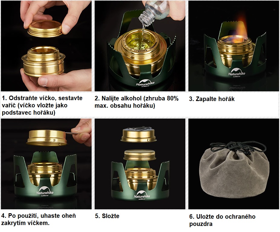 Aparat de gătit de călătorie de încredere Naturehike, care este foarte compact și fiabil. Utilizează alcool sau alte tipuri de alcool ca și combustibil. Greutatea și dimensiunile sale îl fac un companion de călătorie de încredere. Consum: 100 ml de alcool 95% = 60 de minute de preparare. Gătire ușoară în orice vreme.