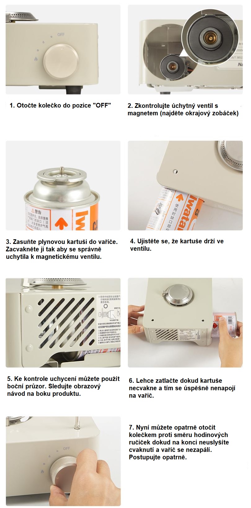 Aragazul este compatibil cu orice cartuș cu o supapă mai mică de 6,9 mm. Se recomandă utilizarea cartușelor de combustibil cu un conținut de butan mai mare de 95%. Cartușele potrivite pentru utilizare pot fi găsite aici.