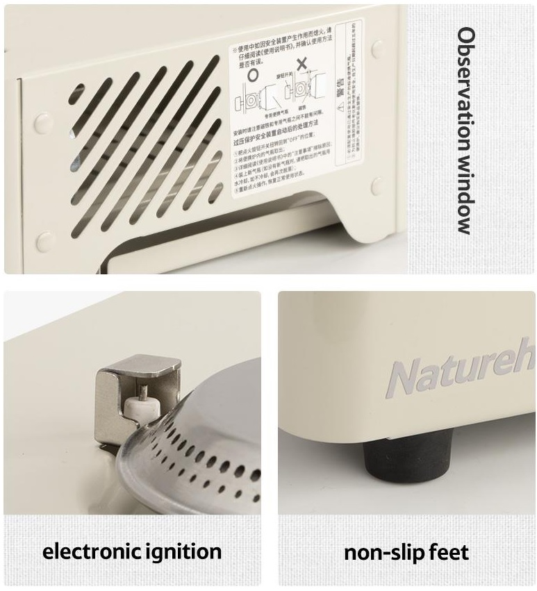 Aragazul este echipat cu o plită, o rotiță de control, picioare cauciucate și un sistem de autoaprindere - astfel încât nu aveți nevoie de chibrituri sau brichetă. Aragazul are o putere mai mare deoarece este capabil să ardă cu o flacără albastră (2KW), ceea ce îmbunătățește eficiența arderii. Este echipat cu o protecție la supratensiune, ceea ce îl face foarte sigur de utilizat.